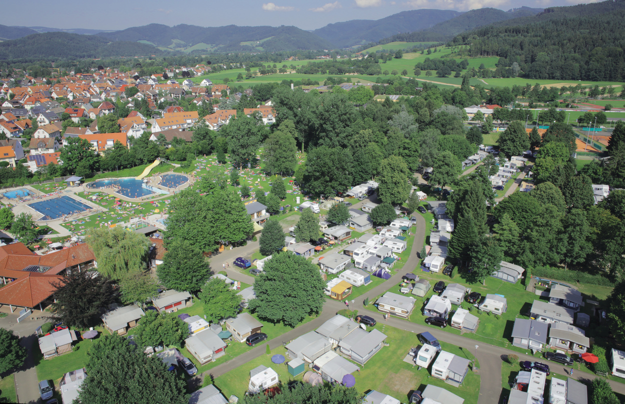 Im klimatisch geschützten Dreisambecken befindet sich Kirchzarten, an dessen südlichen Ortsrand der Campingplatz gelegen ist. Direkt neben dem Platz gibt es ein Freibad u.a. mit 25-Meter-Bahn, Sprungturm und einer Wassertemperatur von 23°C. Die Badbenutzung ist im Übernachtungspreis eingeschlossen
