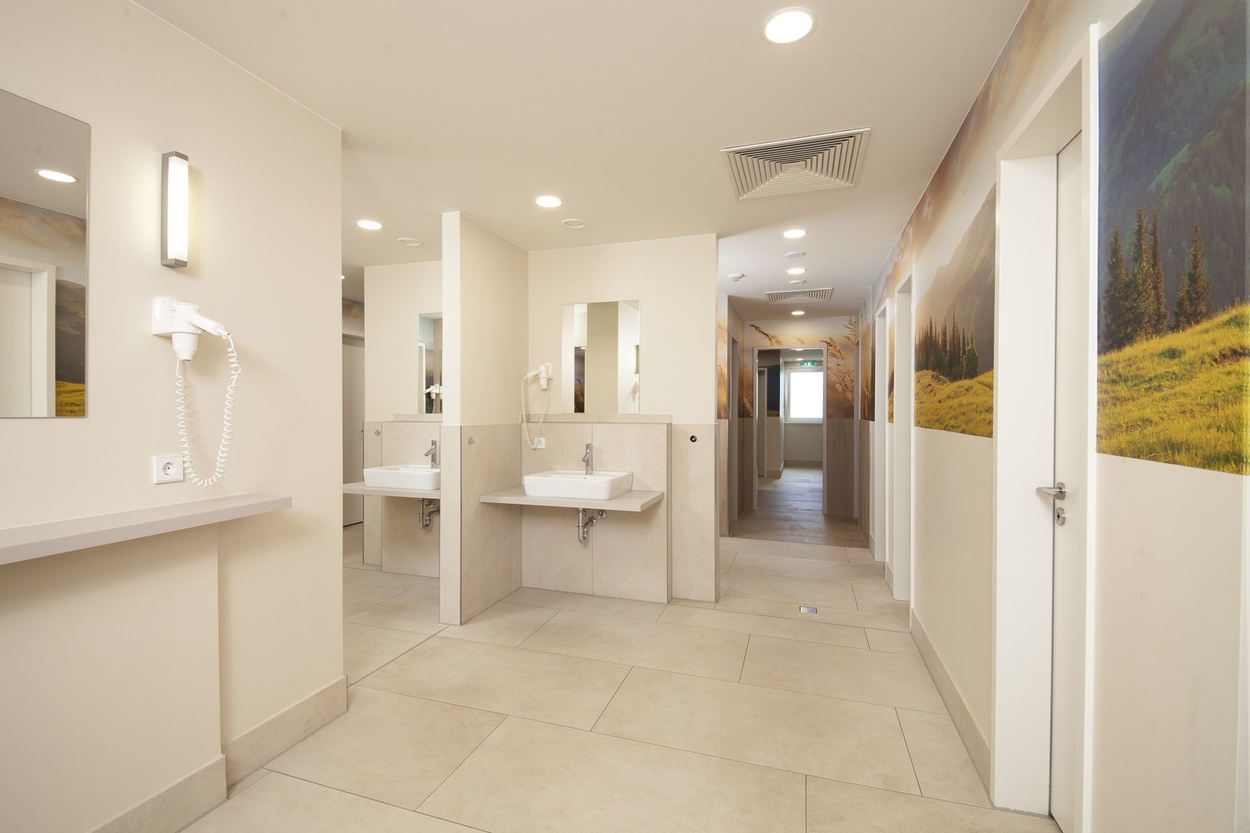 Ausstattung:3 Sanitärgebäude mit 70 WC, 71 Waschbecken, 30 Warmduschen, 6 Fußwaschbecken, Spezial-Behinderten-Räume, Küchen- und Waschhäuser mit Geschirrspülbecken, Waschautomaten, Schleudern und Trocknern, Bügeltischen, Platzbeleuchtung.
