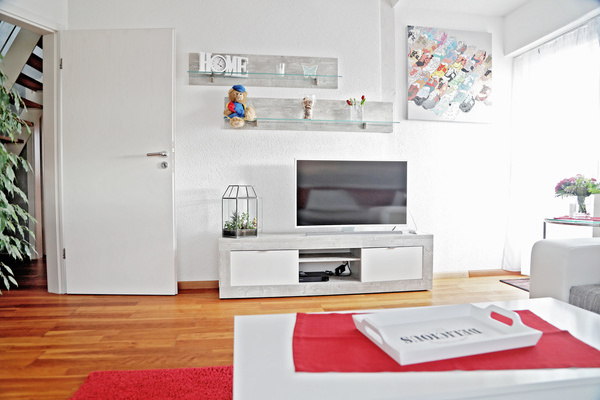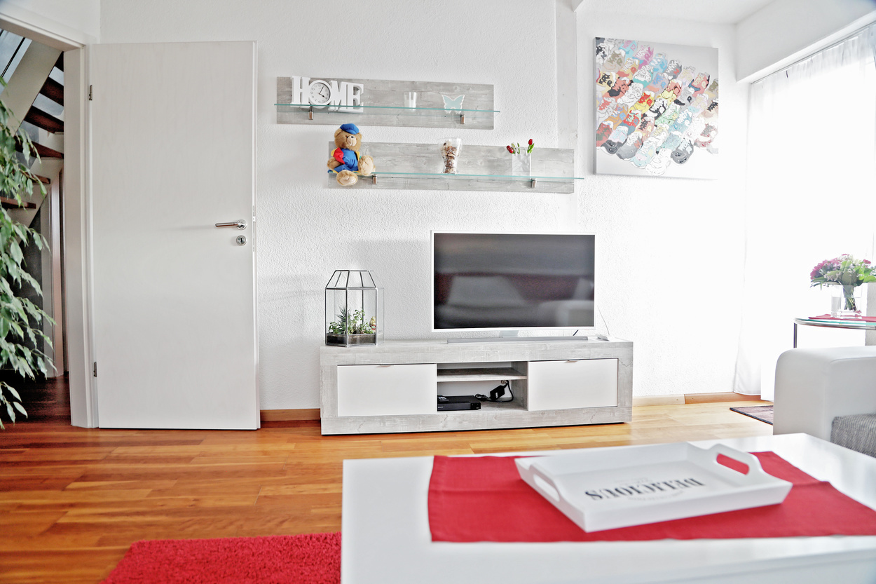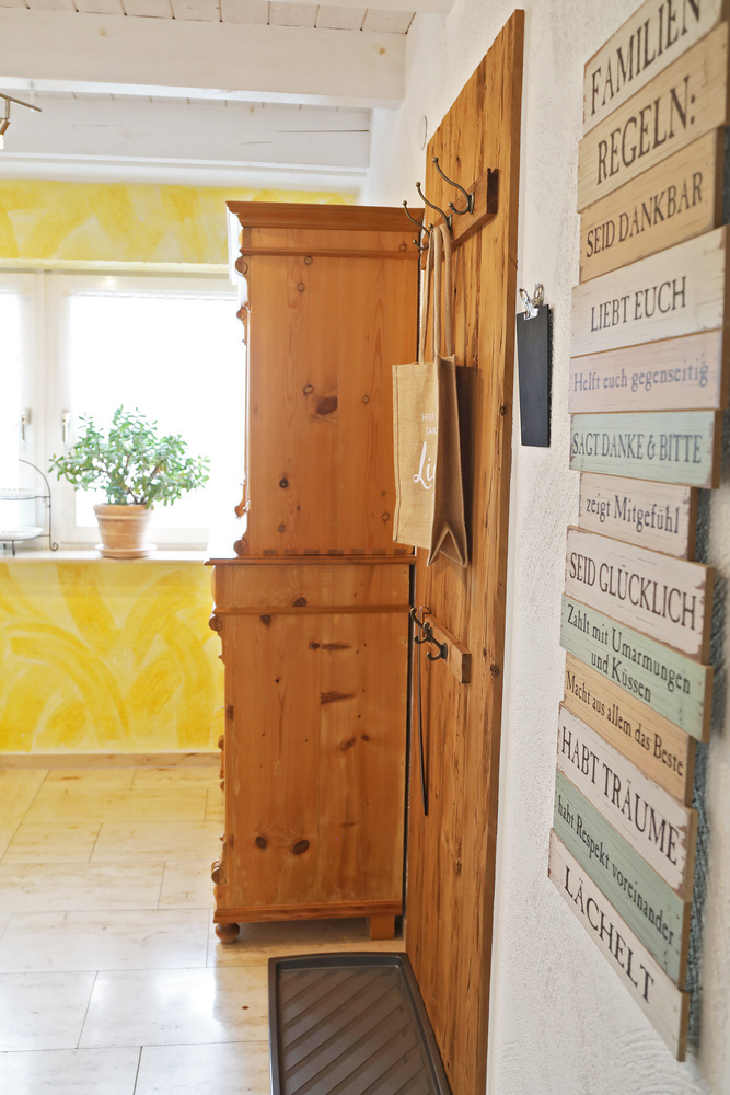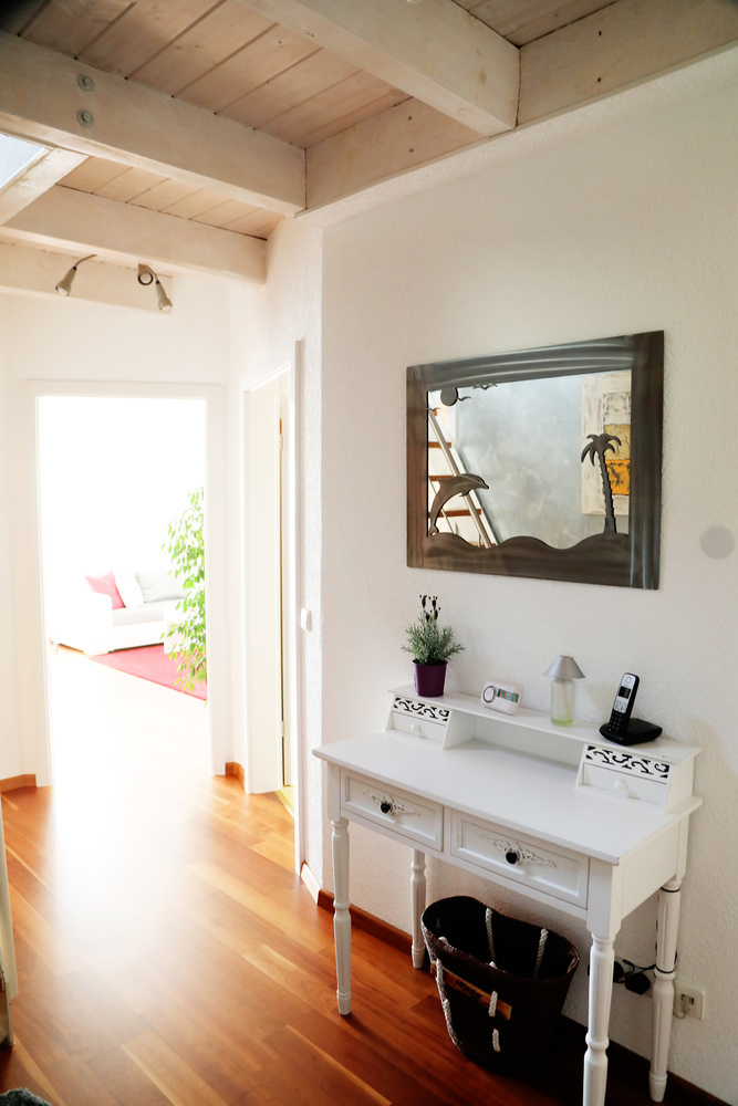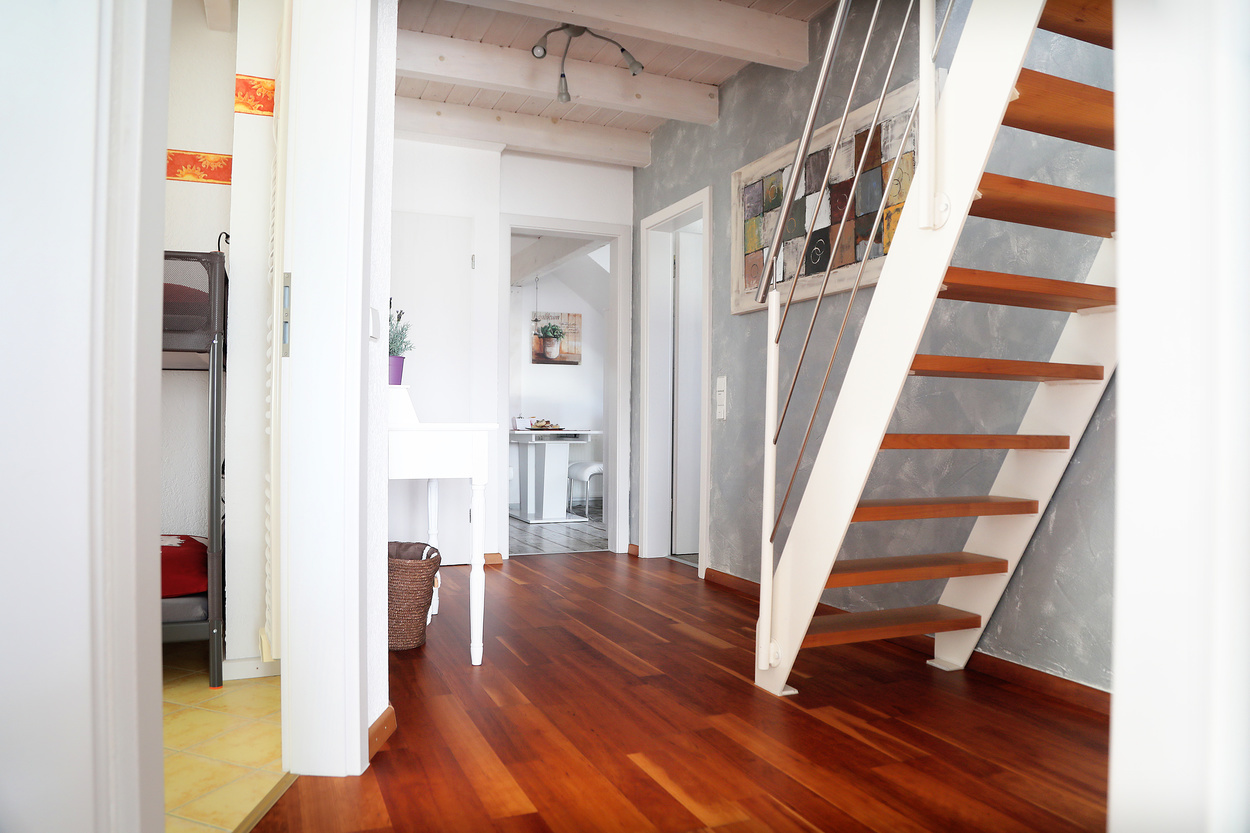Die Ferienwohnung im 1. Obergeschoss ist modern und hell eingerichtet und bietet genug Raum für Familien mit Kindern. Die Ausstattung ist kinderfreundlich und verfügt über Beistellbett sowie Kinderhochstuhl etc.