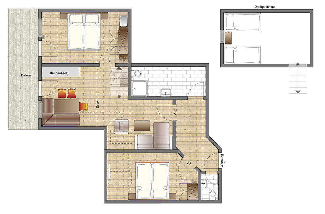- 2 Schlafzimmer mit Doppelbetten