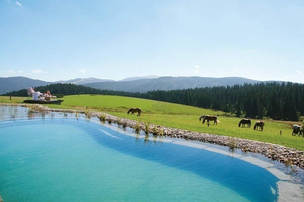 ins Panorama. Ob zu zweit oder für ihre private Feier. Die familiäre und ehrliche Gastfreundschaft ist überall spürbar. Das Badehaus (1.100 m2) zeigt drinnen wie draußen seine Vielfalt: Von Massagen bis Kosmetik. Von Saunen bis Naturbadeteich. Das betreute Aktivprogramm ergänzt täglich wechselnd: Yoga, Chi, Nordic Walking, Wandern oder Schneeschuhtouren. E-Bikes und Mountainbikes stehen zum Verleih.
