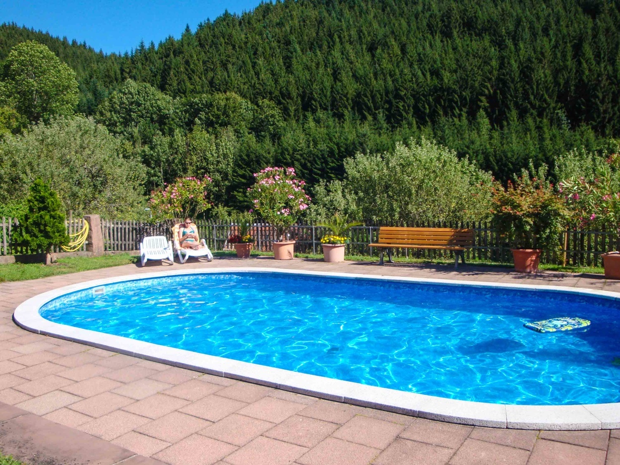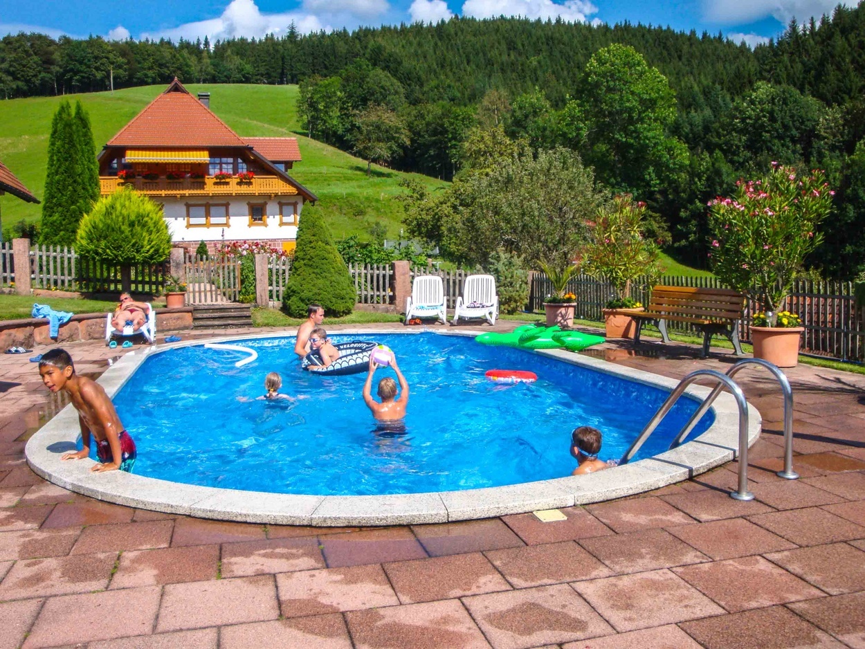 Große traumhafte Liegewiese mit Swimmingpool, Gartenmöbel, Spielhaus mit Rutsche, Lagerfeuerplatz, Grillstelle, Tischtennis, Trampolin, große Weißtannensonnenliege.